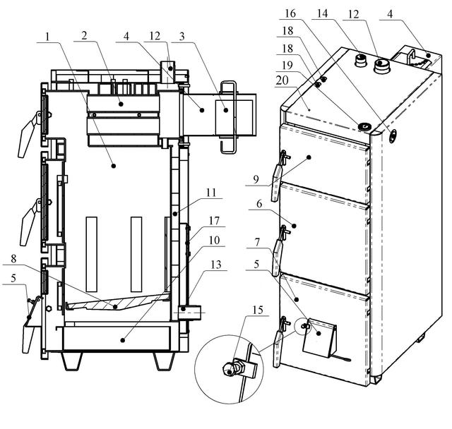 Основною частиною твердопаливного котла Проскуров АОТВ-16 Mn є сталевий теплообмінник 1, 3 — шибер; 4-димовідвідний патрубок; 5-дверцят подавання повітря; 6-завантажувальні дверцята; 7-дверцята чищення колосників і видалення золи; 8-колосники; 10 місткість для попелу; 11-водяна сорочка теплообмінника; 12-патрубок подавання теплоносія в систему; 13-зворотний патрубок; 14-патрубок для встановлення групи безпеки; 15-гвинт для регулювання подавання повітря; 16-нарізна втулка для встановлення регулятора RT3; 19-казівки температури; 20 — декоративні панелі.